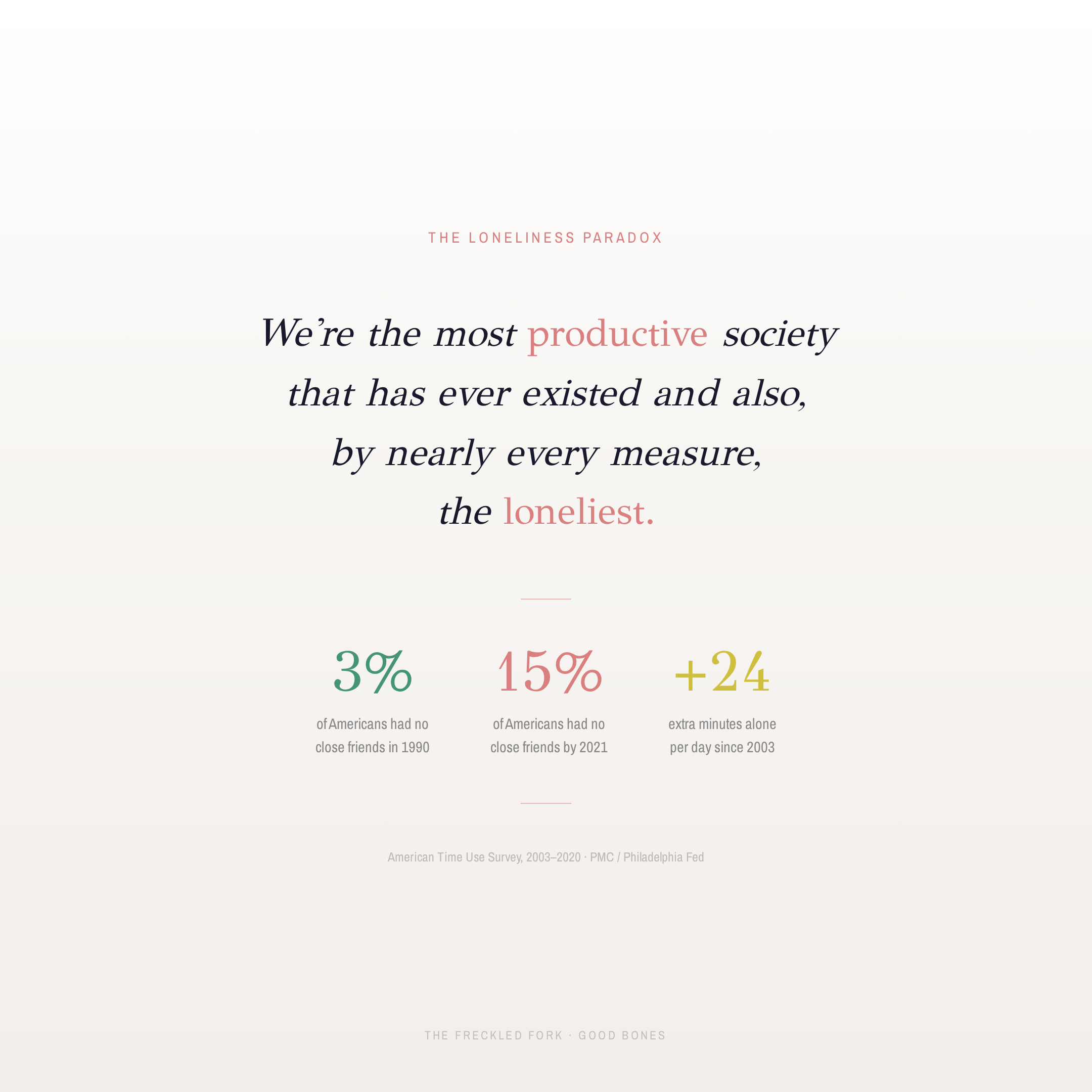 Since 2003...before smartphones, before the algorithm, before any of it fully took hold...the average American started spending an extra 24 minutes a day alone…that’s 12 more hours a month. By 2019, time spent with friends had dropped from more than 6 hours a week to less than 4. We didn’t lose each other all at once...we’ve been losing each other in increments while we were too busy trying to perfect everything else. And underneath all that isolation, all that division, strangers have become a liability...they’ve become some THING to manage or contain instead of some ONE to welcome.