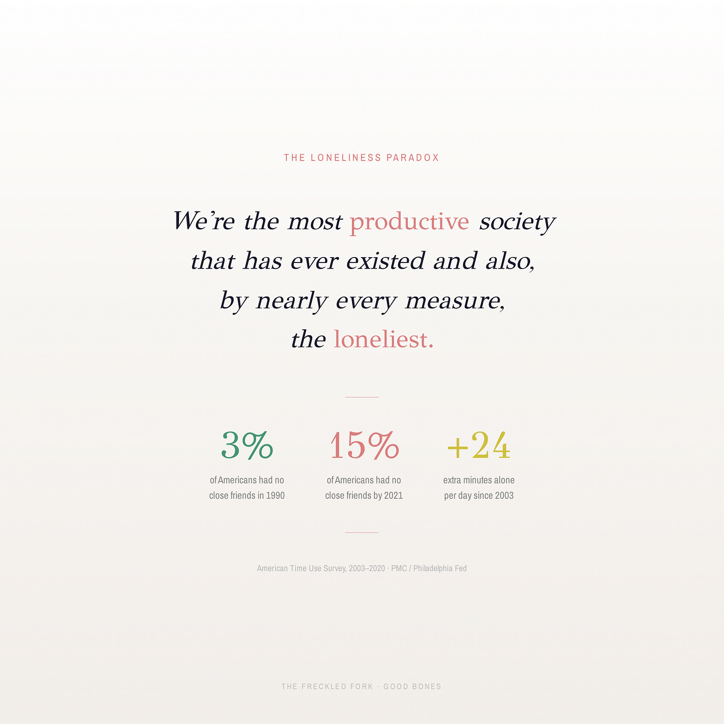 In 1990, 3% of Americans reported having no close friends. By 2021, that number had risen to 15%...a fivefold increase over thirty years. Did people get less likable? Maybe. Did we get more divided because of politics? Money? Social issues? Probably. But maybe at its core, it’s because we’ve actually been building a world that makes it increasingly harder to really know each other. Derek Thompson called this the Anti-Social Century, and the numbers back it up.